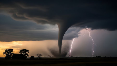 A stunning visual of a tornado forming over a rural landscape, showcasing the power and intensity of natural disaster against a dramatic sky.