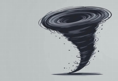 A dramatic illustration of a tornado displaying swirling motion and energy against a gray backdrop, perfect for conveying themes of nature, chaos, and power.