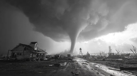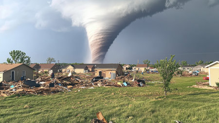 An intense tornado twists through a desolate landscape, shattering homes and creating chaos. Dark clouds loom ominously above, highlighting the power of nature in this dramatic scene.
