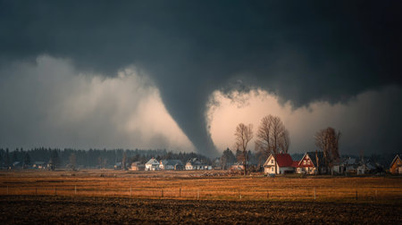 A powerful tornado descends over a rural area, with dark clouds swirling ominously above. The lighting creates an eerie atmosphere as homes and trees are in the foreground.