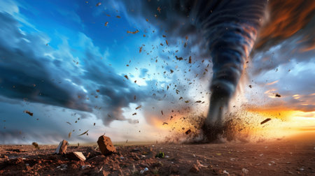 A powerful tornado swirls wildly in a dramatic sky, sending debris and dust erupting from the ground, showcasing the raw energy of nature's fury.