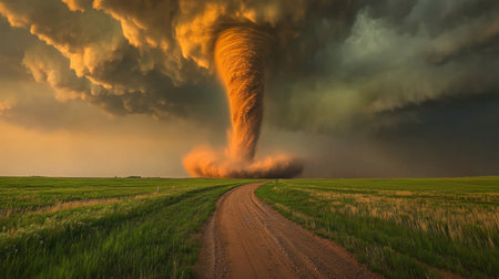 A stunning tornado forms dramatically over a rural landscape, with golden fields and a dirt road leading into the heart of the storm, capturing nature's raw power.