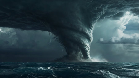 A fierce tornado descends from dark storm clouds, unleashing chaos and destruction. This dramatic scene captures the raw power of nature in action.