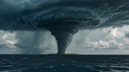 A large funnel cloud is seen over a body of water. The sky is dark and cloudy, and the water is calm. The scene is both beautiful and ominous, as the funnel cloud looms over the water