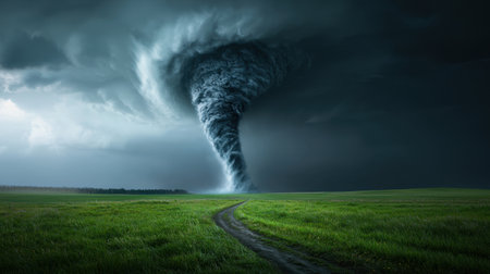 A stunning tornado spirals majestically above green fields, highlighting the raw power of nature, with dramatic clouds and an inviting dirt road leading into the picturesque rural landscape.