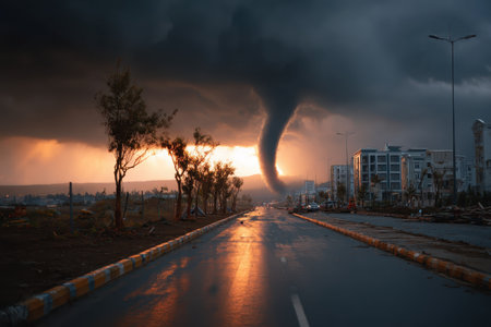 Tornado forming on urban road during dramatic weather event in late afternoon