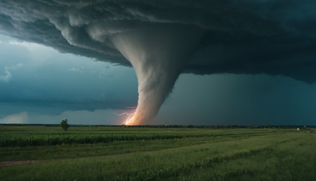 A powerful tornado forms in an open field, surrounded by dark clouds. The image captures the sheer energy and beauty of nature's fury, highlighting the chaotic elements of a storm.