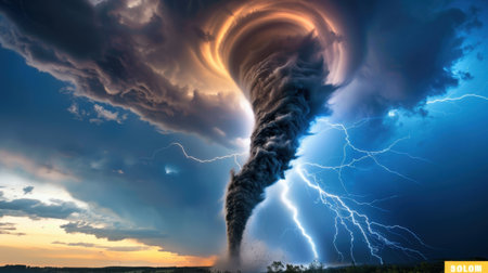 An imposing tornado forms and descends upon a rural landscape, surrounded by intense storm clouds and striking lightning, capturing nature's raw power.