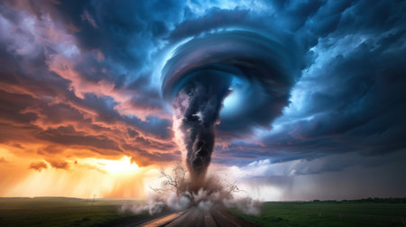 A powerful tornado descends from a turbulent sky, its funnel illuminated by the breathtaking colors of a dramatic sunset.