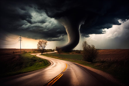 Large funnel cloud descends from dark, rotating storm clouds over fields and a quiet country road, evoking feelings of danger, destruction, and the raw power of nature