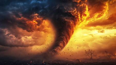 A fierce tornado descends from dark storm clouds, unleashing chaos and destruction. This dramatic scene captures the raw power of nature in action.