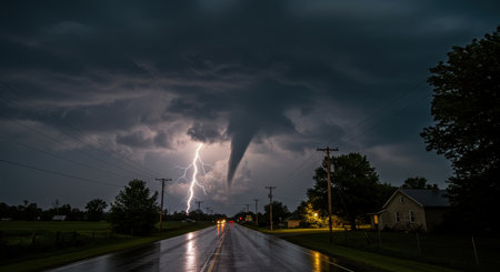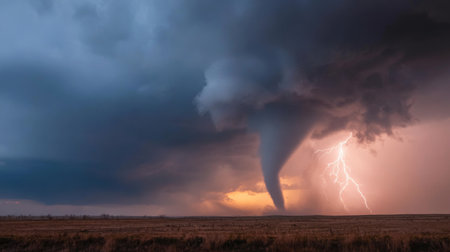 Dramatic tornado swirling amidst lightning thunderstorm raw force of nature disaster