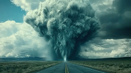 A massive tornado with dark clouds and lightning in the sky over an empty road, symbolizing natural forces such as tornadoes or extreme weather events. --chaos 30 --ar 16:9 --v 6.1 Job ID: 8e7c929a-ce73-43f1-8d32-4d71927a3afe