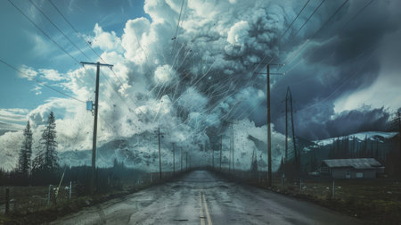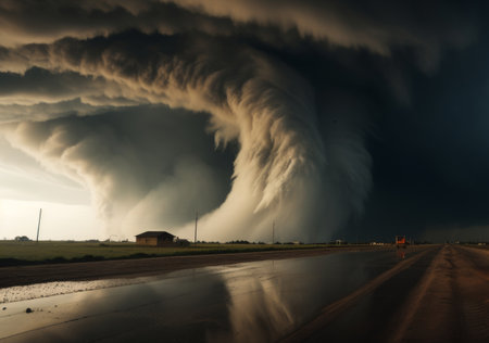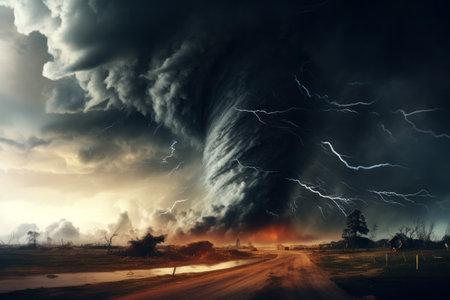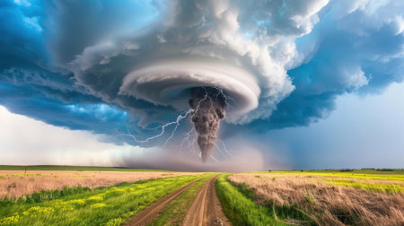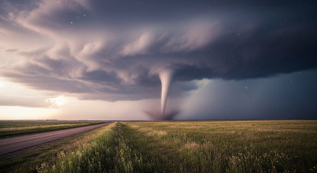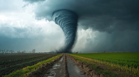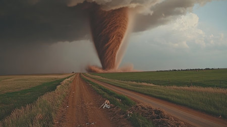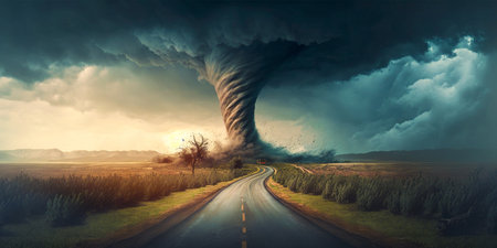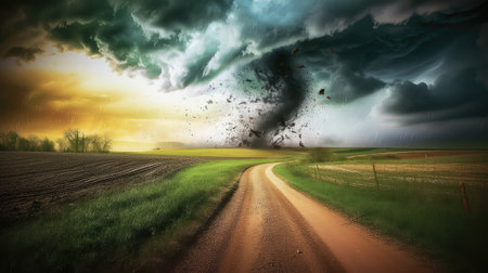 Captivating view of a tornado forming in a dramatic sky above an empty rural road, showcasing the intensity of nature and the beauty of stormy weather over lush green fields.