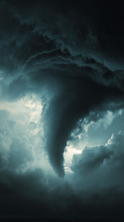 A dramatic low-angle view captures the immense and terrifying power of a supercell tornado. The turbulent vortex of the funnel cloud churns the sky, creating a scene of both awesome natural beauty and imminent destruction, perfect for illustrating themes of chaos, climate change, and overwhelming force.
