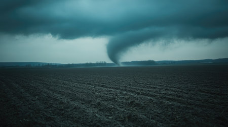 A powerful tornado descends from dark storm clouds over a grassy field. The scene presents a dynamic composition with swirling air and a turbulent sky. The color palette consists of cool tones and natural textures, creating a sense of impending danger. This imagery could be used for various commercial or editorial projects.