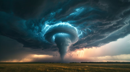 A powerful tornado forms in an open field, surrounded by dark clouds. The image captures the sheer energy and beauty of nature's fury, highlighting the chaotic elements of a storm.