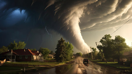 A powerful storm looms over a peaceful rural town, foreshadowing potential peril for its residents, Tornado disaster concept, AI Generated