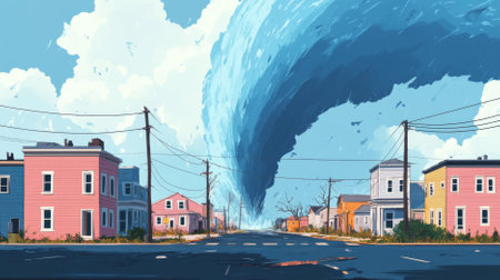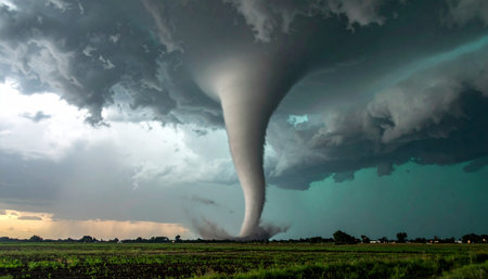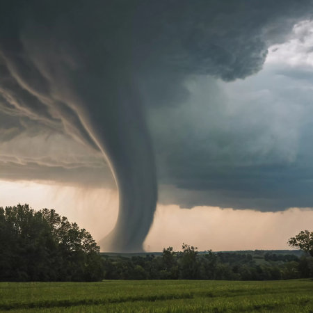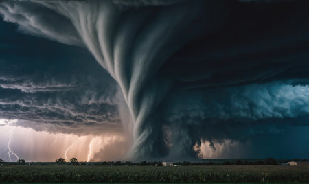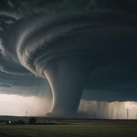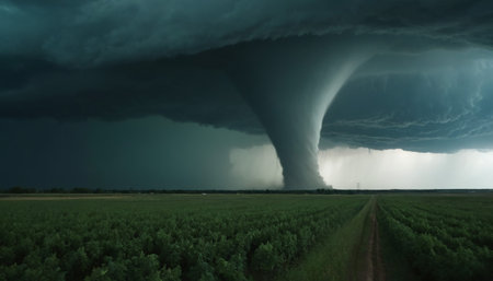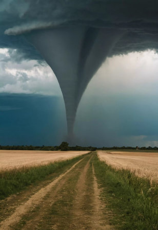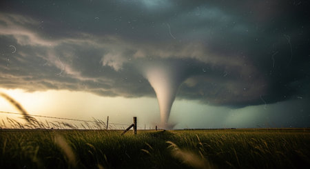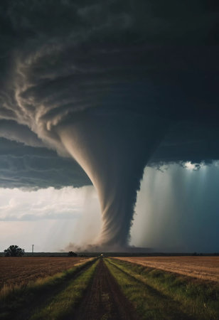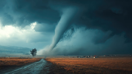 An awe-inspiring tornado spirals down from dark storm clouds, creating a dramatic scene over a rural landscape. The contrasting colors highlight nature's power.