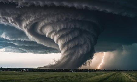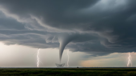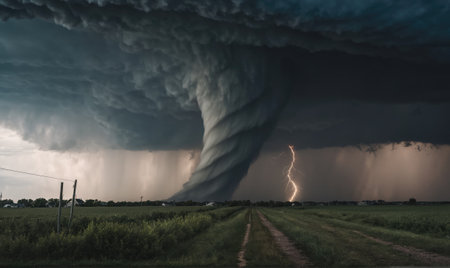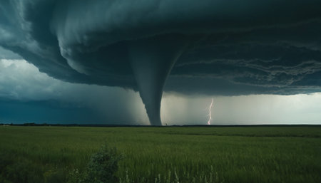A massive tornado touches down in a green field accompanied by striking lightning bolts under a dark, ominous sky. This dramatic weather scene highlights the destructive power of nature.