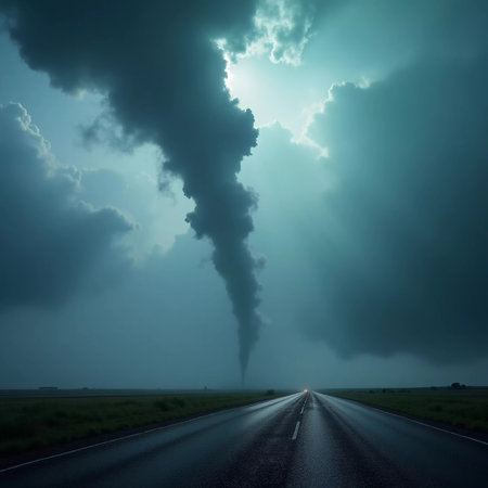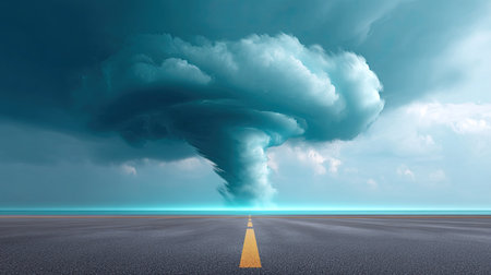 A menacing tornado forms beneath dark storm clouds, stretching down to the ground along an empty highway.