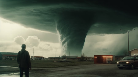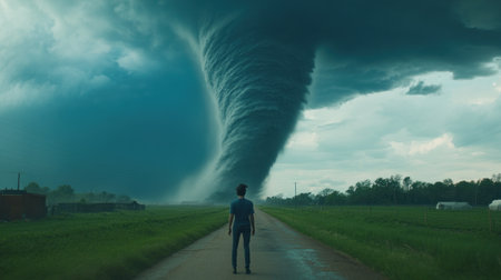 A man stands on the road, gazing at an enormous tornado in front of him. The sky is dark and filled with black clouds, creating an ominous atmosphere. He appears to be captured from behind, his feet visible as he walks towards the towering vortex. This scene captures the moment when people face the challenges that nature may present them with. --chaos 30 --ar 16:9 --v 6.1 Job ID: 0feb15b8-699a-4d29-9260-839d8fb357c1