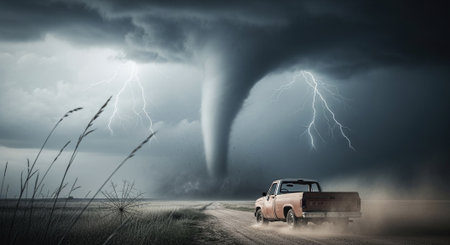 Conceptual image of tornado approaching an old car on rural road