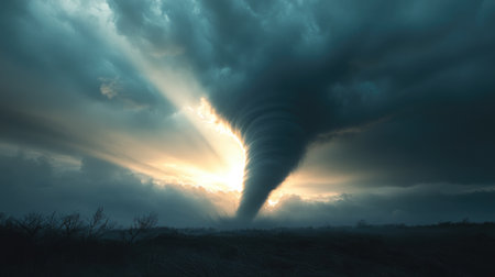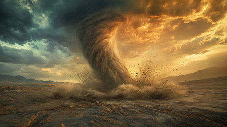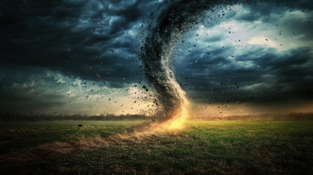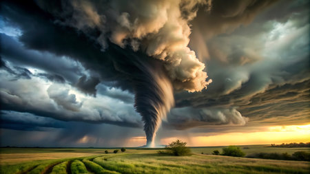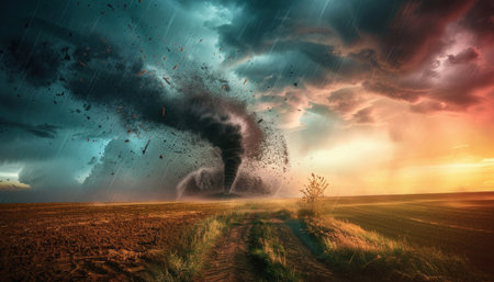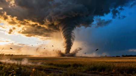 A powerful tornado descends from dark clouds, swirling with intensity amidst a tranquil rural field. The setting sun casts a warm glow, enhancing the dramatic atmosphere. Generative AI.