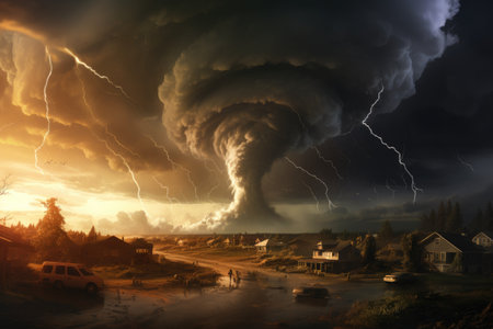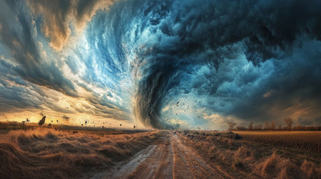 An artistic image of a tornado touching down in a rural area, with a dramatic sky and swirling debris captured in a wide-angle shot
