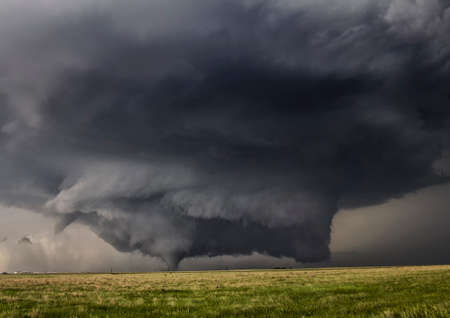 A powerful tornadic thunderstorm rolls over plains