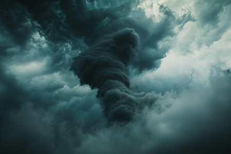 A powerful tornado vortex made of thick gray smoke twists upward against a stormy gradient background. This dramatic abstraction is ideal for conceptual posters or scientific themes.