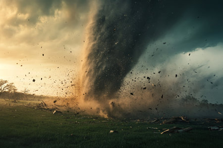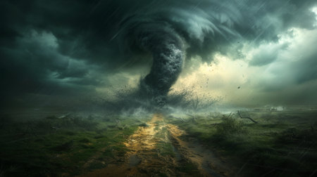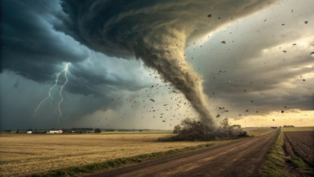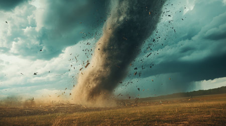 A powerful tornado twisting through a rural landscape, with dark, ominous clouds and debris being lifted into the air, illustrating the destructive force of the storm.