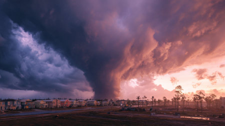 Dark storm clouds loom ominously over a suburban area, with a tornado forming in the distance as the sun sets, casting dramatic colors across the sky.
