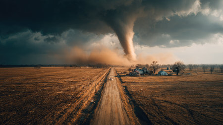 A powerful tornado forms over a vast rural landscape, creating a dramatic scene with dark clouds and swirling dust. The setting reveals the raw power of nature.
