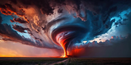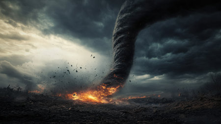 Powerful tornado sweeps through a fiery landscape, creating a breathtaking and terrifying scene of nature's fury, marked by dark storm clouds and swirling winds.