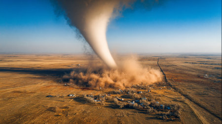 A breathtaking aerial view of a powerful tornado forming over a rural landscape, showcasing the swirling dust and dramatic clouds in an extraordinary display of nature's force.