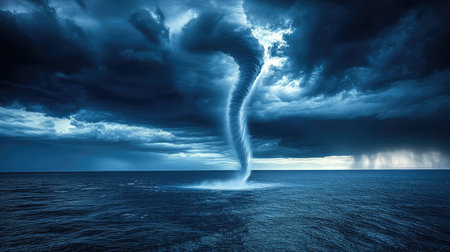 Witness a stunning tornado emerging from the ocean, surrounded by swirling waves and dark storm clouds, creating a breathtaking atmospheric phenomenon over the sea.