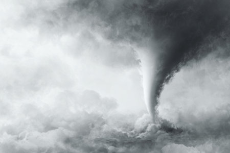 A stylized tornado funnel forms over a smoky prairie, rendered in grayscale tones against a cloudy backdrop. This intense image is ideal for science-themed or dramatic visuals.