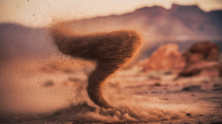 A stunning dust storm whirls dramatically against a vivid sky at twilight, showcasing the power of nature and the beauty of atmospheric phenomena.