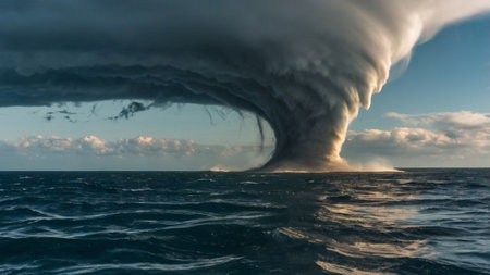 A tornado forming over a calm ocean, with dramatic skies