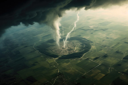 aerial view of twisting tornado over vast landscape, created with generative ai