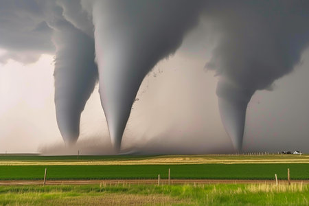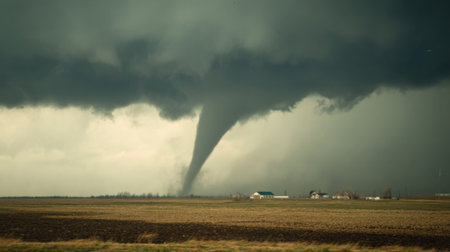 An awe-inspiring tornado spirals down from dark storm clouds, creating a dramatic scene over a rural landscape. The contrasting colors highlight nature's power.