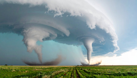 A breathtaking and terrifying display of natures raw power as two massive tornadoes simultaneously touch down from an immense supercell thunderstorm. The ominous, rotating clouds loom over a vast green landscape, creating a scene of both apocalyptic beauty and imminent danger.