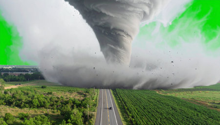 A lone car travels down a deserted highway, heading directly into the path of a colossal, swirling tornado. This dramatic scene illustrates danger and risk, with green screen elements for easy compositing in film or visual effects projects.