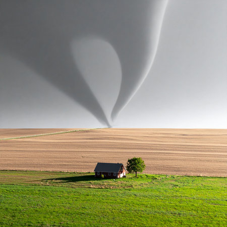 A stunning visual of a tornado forming over a rural landscape, showcasing the power and intensity of natural disaster against a dramatic sky.