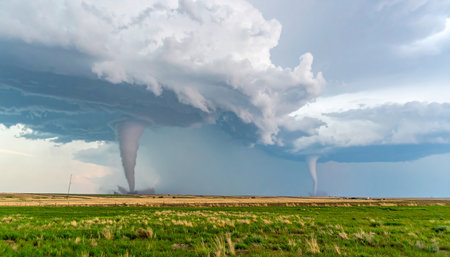 A massive supercell thunderstorm unleashes its incredible power, spawning two distinct tornadoes that churn across the open plains. This dramatic and awe-inspiring scene captures the raw, untamed force of nature in a moment of extreme weather.