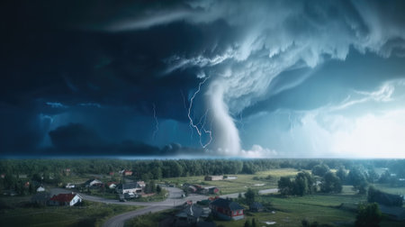 AI Generated. Powerful tornado descends over rural village during stormy weather