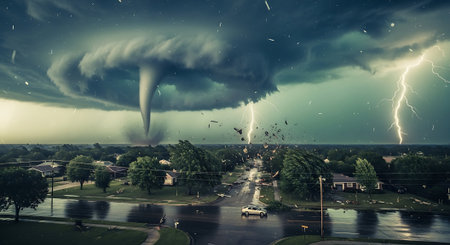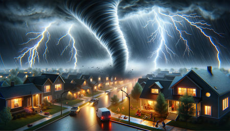 A powerful tornado approaching a residential area during a thunderstorm. Lightning pierces the sky, casting sharp, fleeting shadows on houses and panicked people trying to find shelter.