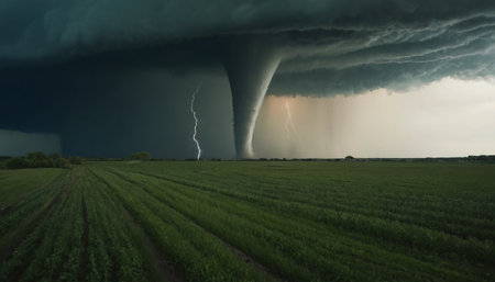 A massive tornado funnel touching down in a rural field accompanied by lightning bolts and dark ominous clouds. The dramatic weather event captures the raw power and destructive potential of nature.