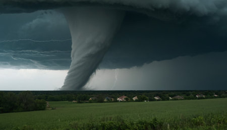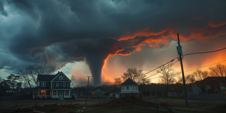 A powerful tornado descends over a rural area, with dark clouds swirling ominously above. The lighting creates an eerie atmosphere as homes and trees are in the foreground.